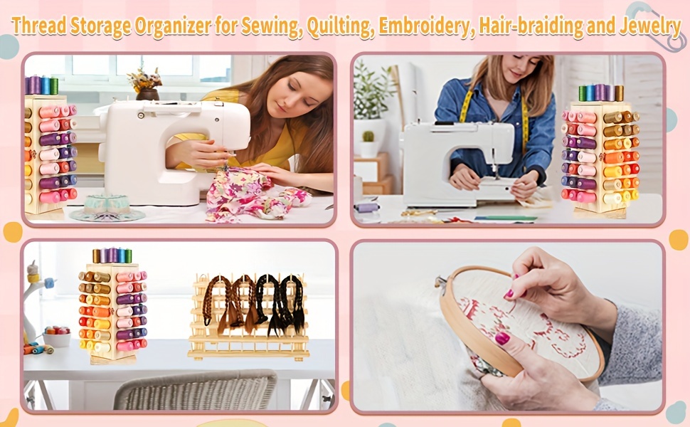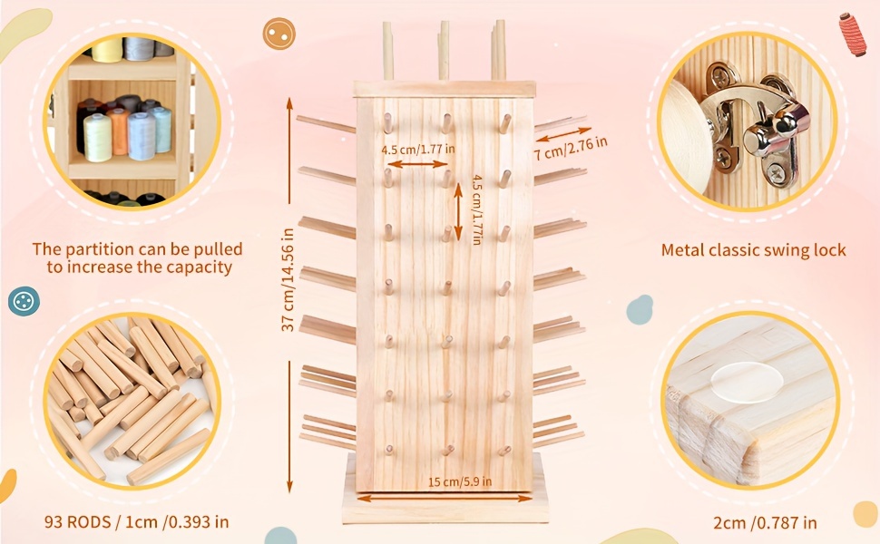 93 Spool 360° Fully Rotating Wooden Thread Rack Stand with Pull-out Divider for Sewing, Quilting, Embroidery, Hair-braiding, and Jewelry Thread Storage Organizer